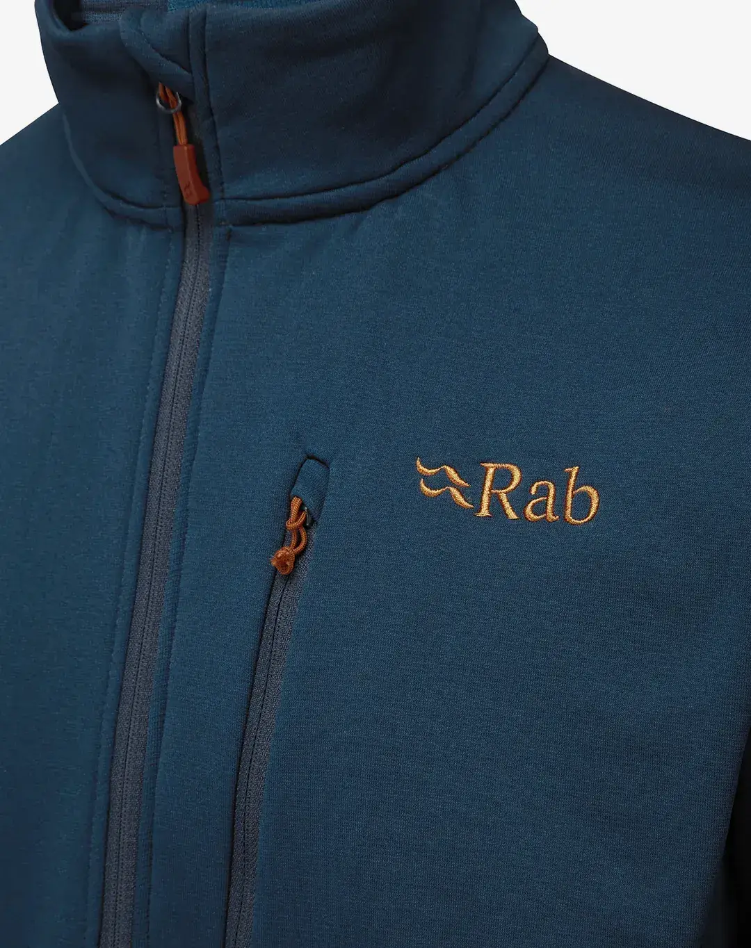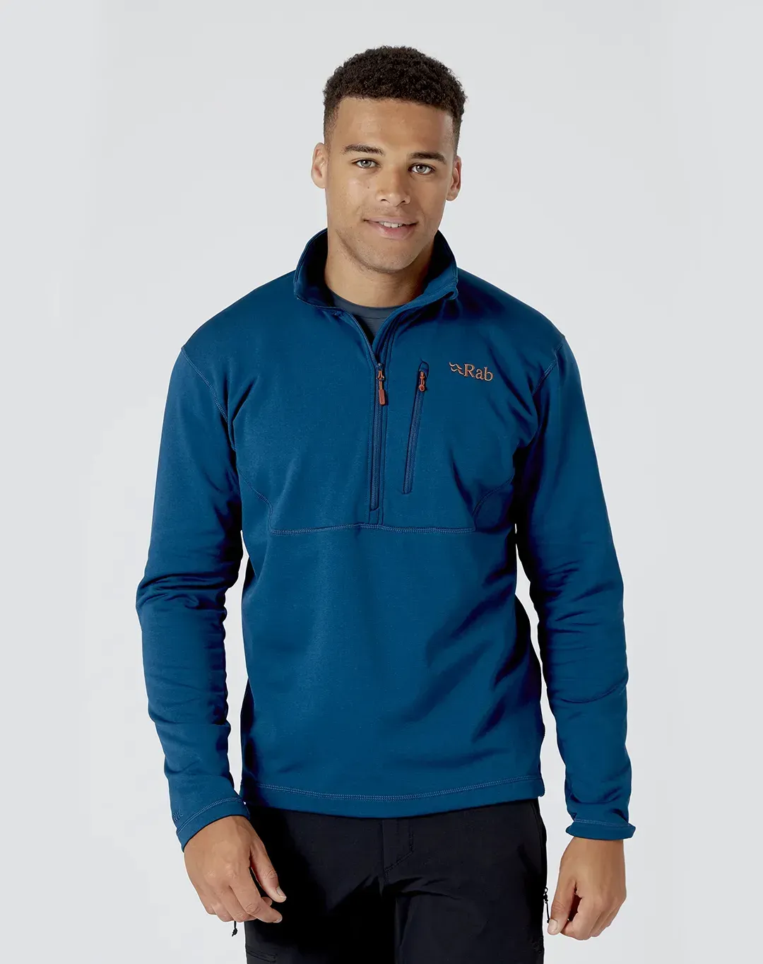 סווטשירט מחמם, נושם ומבודד מבית Rab העשוי פליז אלסטי בשילוב תפרים שטוחים לנוחות מירבית עם עוד שכבות מלמעלה ורוכסני YKK איכותיים